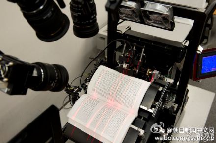 该装置的原理是:机器自动翻页,同时红外线激光捕捉翻页时纸张生成的形状,选出最清晰的瞬间后快速拍照。仪器对图像进行修正处理后,记录成平面形式。