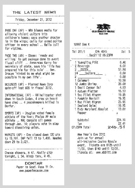 利用账单纸印刷新闻,现在已经不仅仅是英国工作室BERG所独有的想法。美国首府华盛顿最老的一家餐厅Old Ebbitt Grill最近的账单也变得特殊,正面印着正常的报价,而背面则印有一份长度短小的,均有由美联社提供的最新新闻。